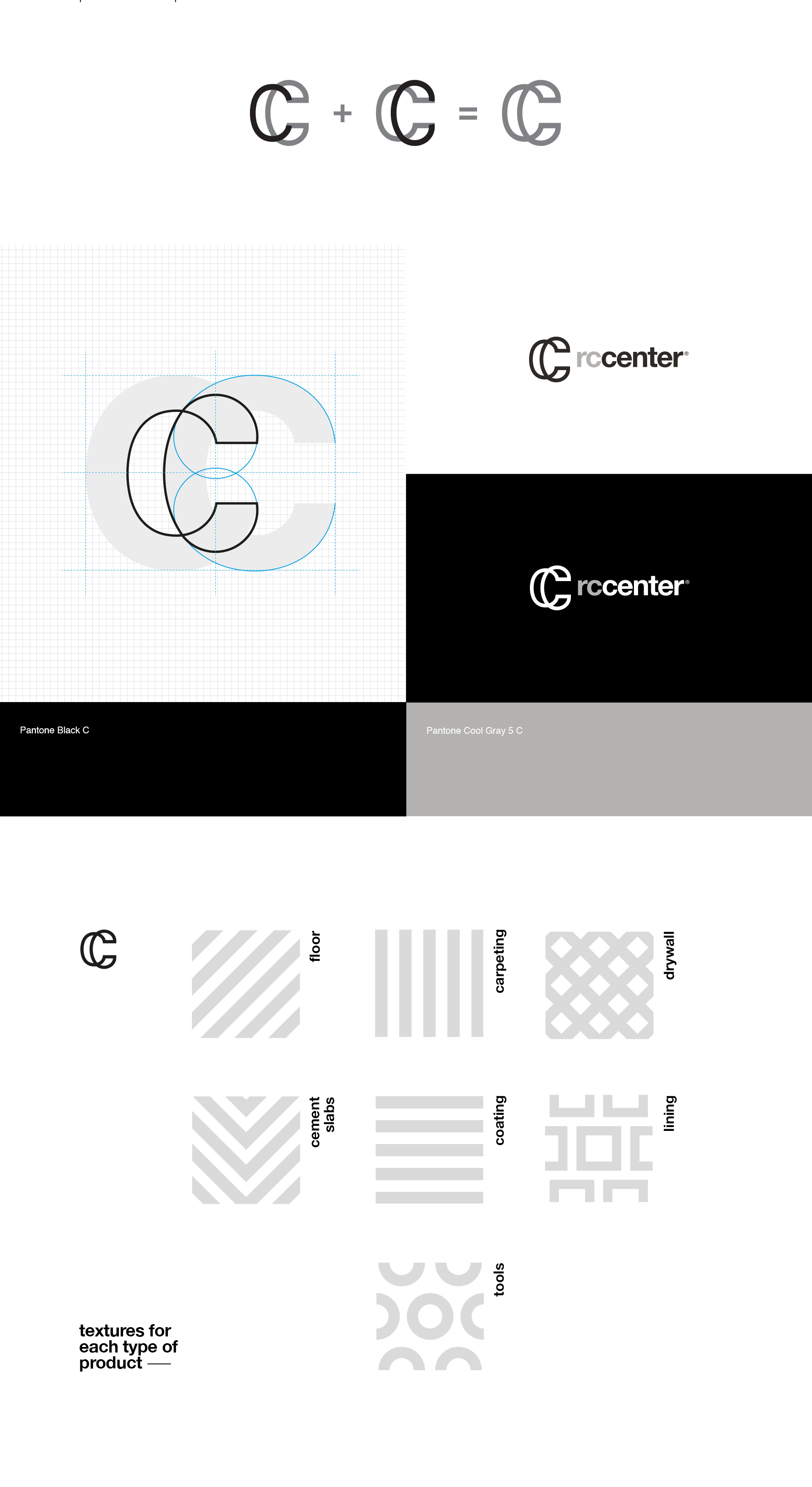 Quando analisamos a forma na qual os pisos e revestimentos são instalados, podemos observar um padrão, uma repetição, assim como a letra “C” é repetida na grafia da marca. Seguindo esse conceito, foi construido um símbolo onde temos duas letras “C”, referente a RCCENTER, formando um símbolo, uma letra “C” tridimencional, que remete a algo tátil, algo que podemos sentir e tocar, assim como os produtos oferecidos pela marca.